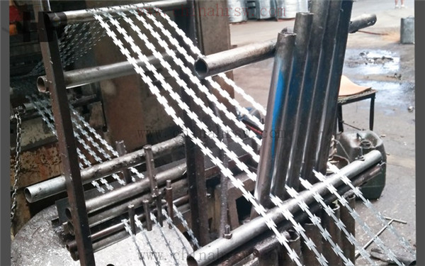 但是這種方式加工的刀片刺繩卻存在一個比較大的劣勢,那就是由于缺乏支撐所以在固定方面比較困難。采用一種可以將其固定在邊框上的方式方法就顯得尤為重要了。這時刀片刺繩采用的連接方式一般為螺絲固定,因為表面或是鍍鋅或涂塑在給其進行焊接處理時造成了很大的困難,所以才使用了這種方式進行固定,這種成本高,主要是尺寸都是客戶訂做的,沒有統一標準,工人做活的時候效率低,不能大批量的生產。